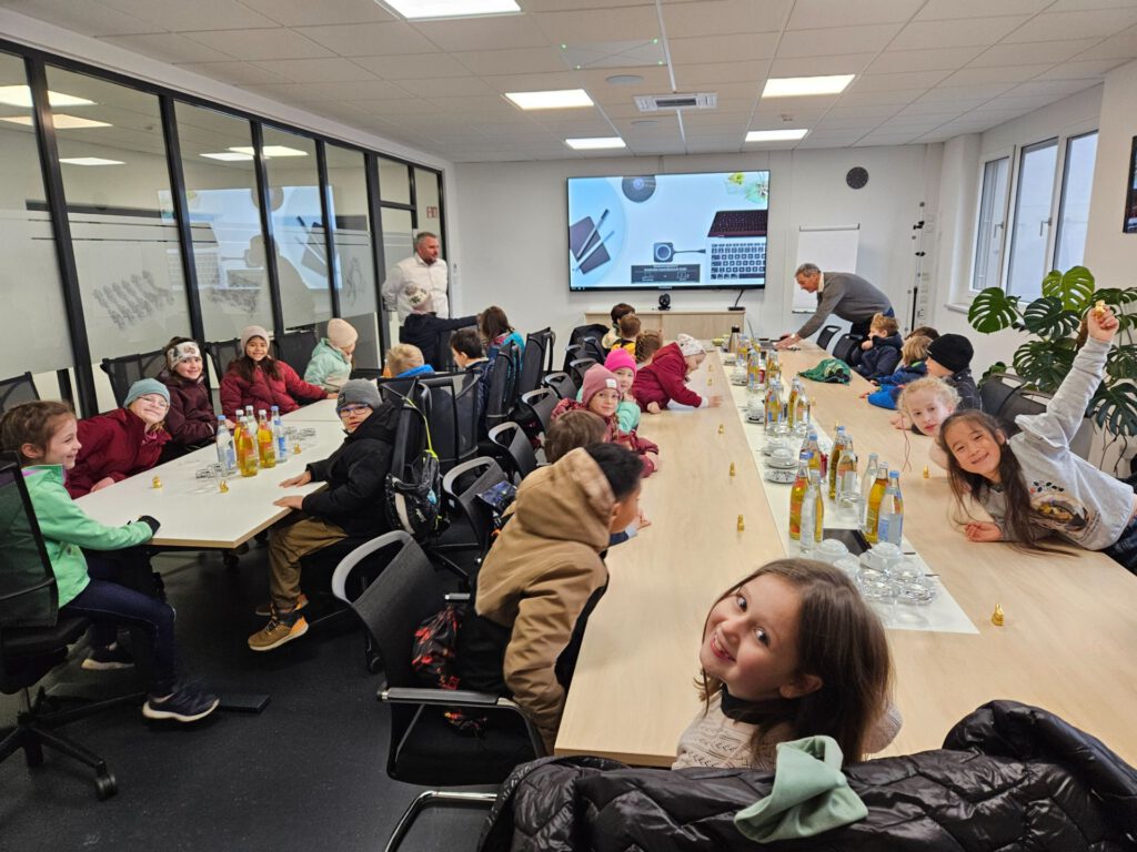 Im Konferenzraum gab er zusammen mit Herrn Häckl, dem Standortleiter, eine Einführung in das Unternehmen – auch per Film – und beide beantworteten geduldig die viele Fragen der Kinder. Anschließend bekam die Klasse 2a eine spannende Führung durch die Produktion, die Lehrlingswerkstatt und die Büros. Nach einer Brotzeit bekam jedes Kind noch eine prall gefüllte Tasche als großzügiges Geschenk. Mit vielen Eindrücken kehrte die Klasse an die Schule zurück.