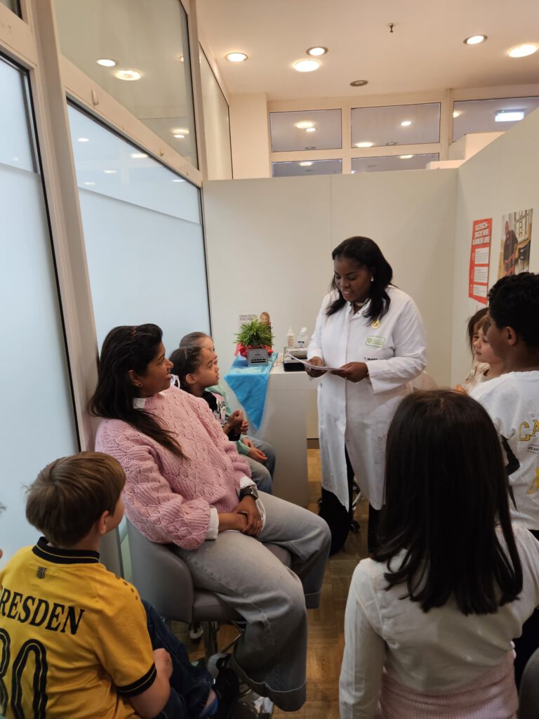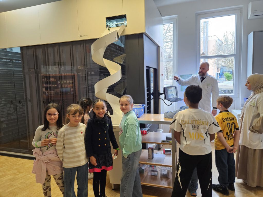 Wir, die Klasse 2a, durfte einen sehr interessanten Ausflug zur Hollis-Apotheke am Klinikum machen. Die Inhaber der Apotheke, Frau und Herr Mainka (die Eltern einer Schülerin), begrüßten uns sehr herzlich und erklärten uns mit vielen Mitmach-Aktionen die Aufgaben einer Apotheke. So durften wir zum Beispiel eine Handcreme anrühren und testen, selbst Medikamente in dem großen Gollmann-Automaten einzulagern und abzuholen. Auch durften wir beim Ohrloch-Stechen zusehen und Quizfragen beantworten. Es machte allen Kindern großen Spaß und wir lernten viel zu unserem HSU-Thema „Berufe“. Zum Schluss bekam jedes Kind noch eine reichlich gefüllte Tasche als Geschenk. Das war eine tolle und den Unterricht bereichernde Aktion!