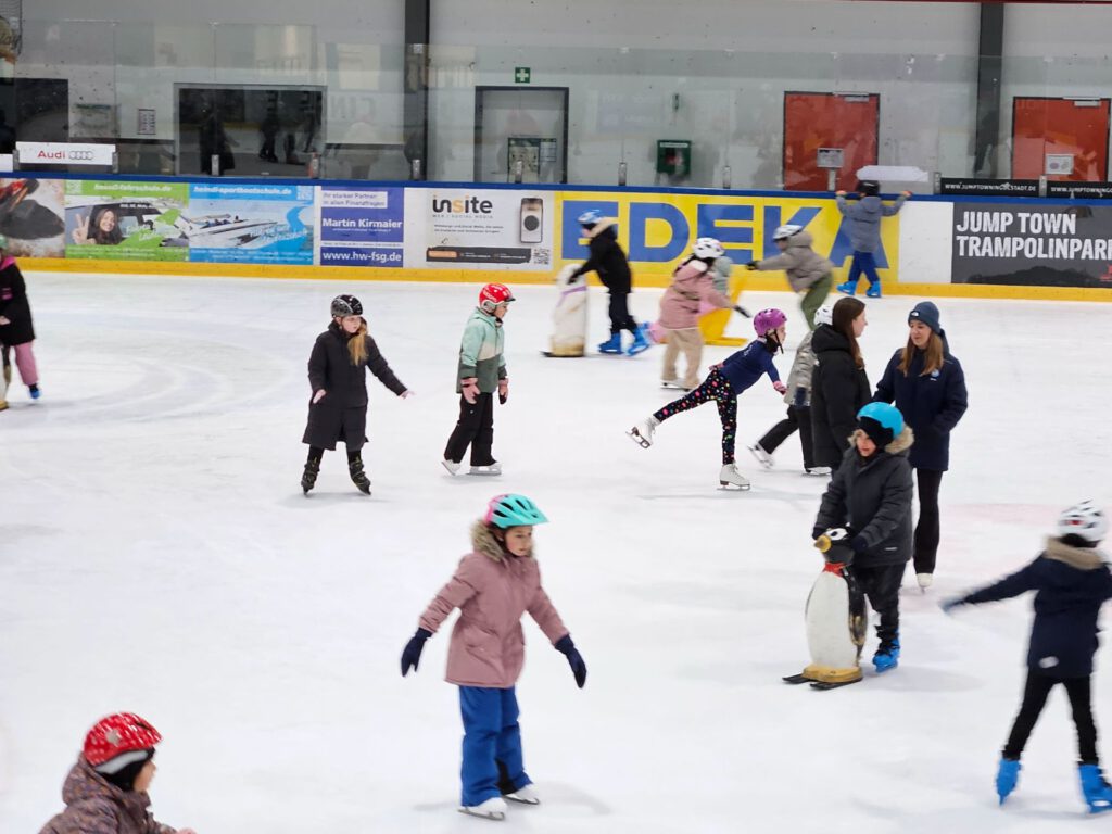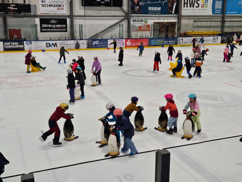 Die Eiskunstlaufabteilung des ERC Ingolstadt ermöglichte allen Kindern der 2., 3. und 4. Klassen einen besonderen Eislauftag. An zwei Terminen gehörte die Eishalle nur uns, den Kindern der Grundschule Auf der Schanz! Mit großer Begeisterung flitzten die einen schon geübt über das Eis, während die anderen erste Erfahrungen auf den Kufen machten. Wieder andere ließen sich sitzend über das Eis schieben. Die Trainer des ERC boten denjenigen, die mochten, ein paar Stationen an. Somit konnten alle Kinder die Eisfläche so genießen, wie sie es wollten.