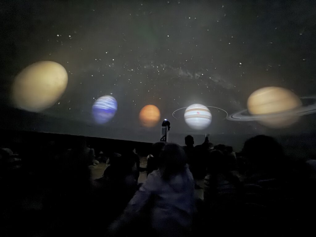 In einer aufblasbaren Kuppel erlebten die Kinder eine spannende Präsentation rund um unser Sonnensystem. Verschiedene Planeten wurden vorgestellt und es wurde erklärt, was unseren Planeten Erde so besonders macht. Der Referent zeigte sich dabei sehr erstaunt, wie viel Vorwissen viele Schülerinnen und Schüler bereits über die Himmelskörper mitbrachten.