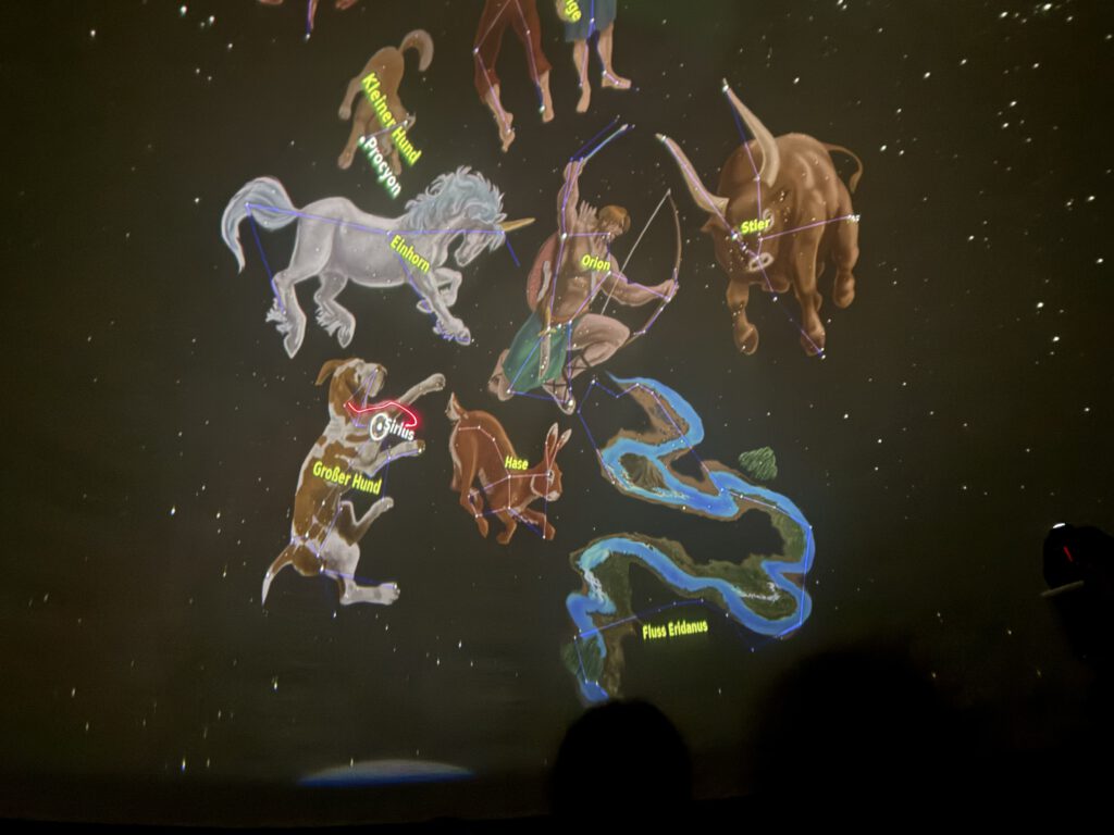 Im Anschluss erfuhren die Kinder, dass viele der heute bekannten Sternbilder bereits von den Griechen benannt wurden. Mithilfe von überlagerten Bildern wurde anschaulich erklärt, wie aus einzelnen Sternen bekannte Figuren und Tiere entstehen.