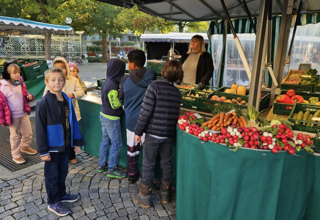 mit ihrer Lehrerin auf den Weg zum Wochenmarkt. Dort stand alles